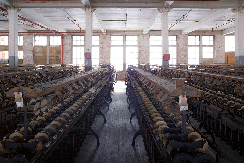 This will give you an idea of what a floor looked like, though the building is probably twice as long. Row after row of machines for . . . doing I don’t know what. Spinning into thread, I know they did that there. And dying it colors. That was in the basement. I have no idea what else.